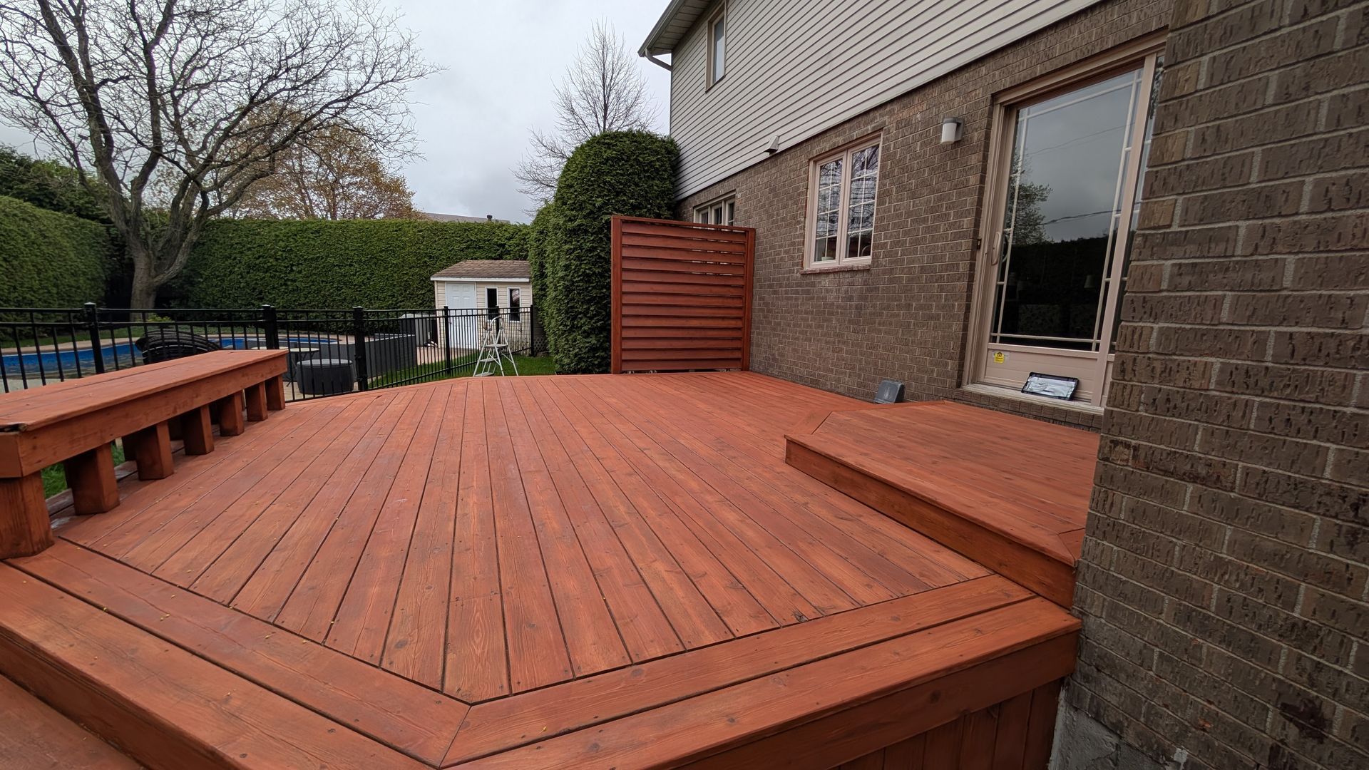 Sablage à la ponceuse et application de teinture sur balcons, clôtures, terrasses et structures en bois.