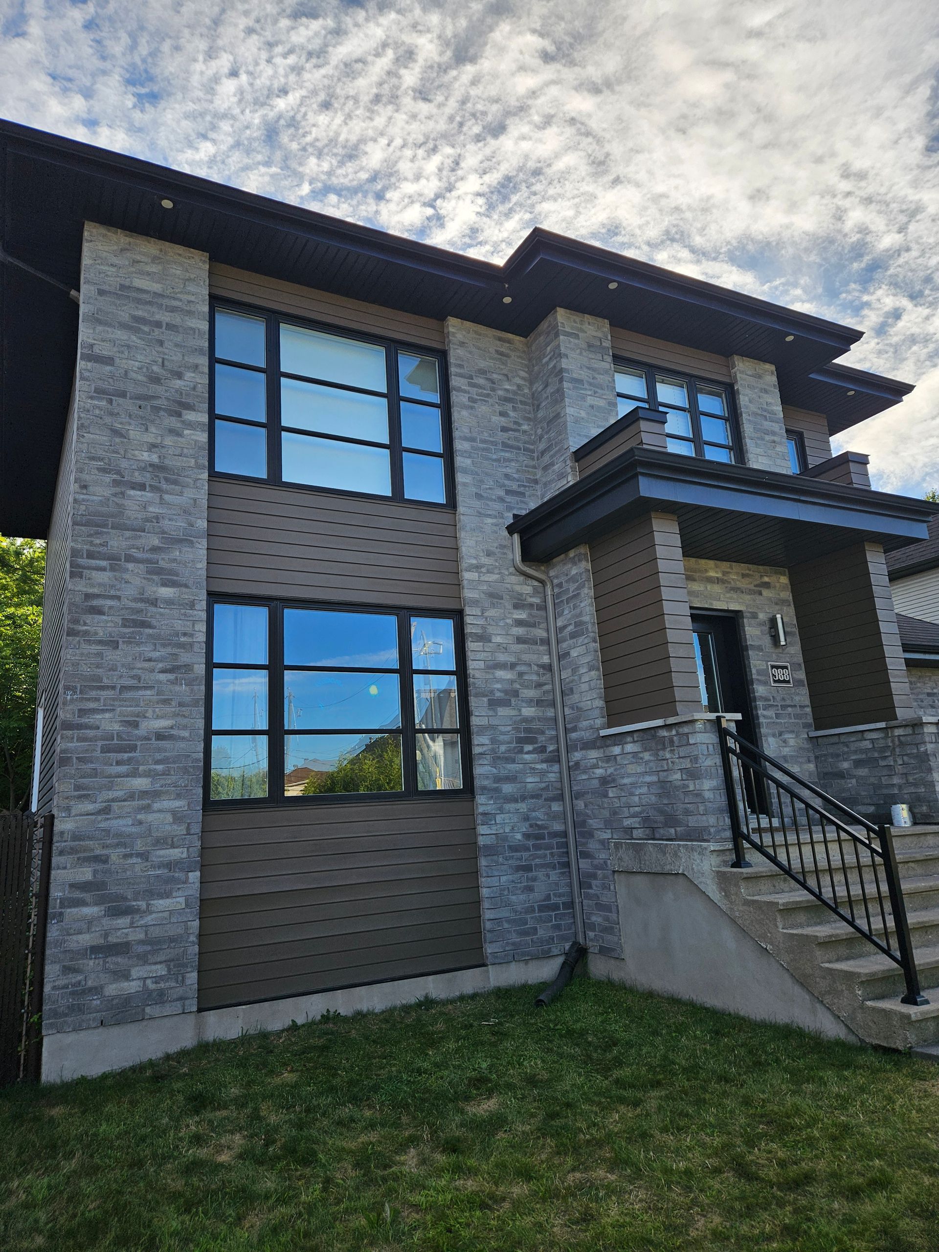 Lavage à pression et application au pistolet sur Canexel, agrégat, Maibec, vinyle, béton, aluminium et brique avec des produits Sherwin-Williams.